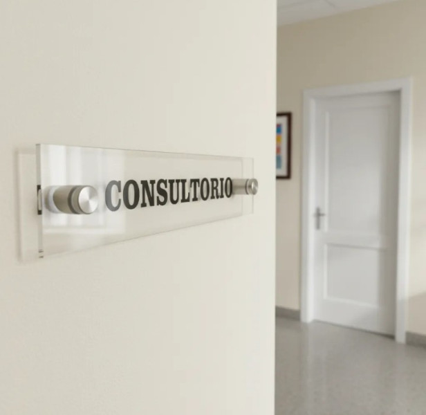 Cartel en acrilico con 2 separadores metalicos, para indicar sala, consultorio, oficina. 30x5cm.